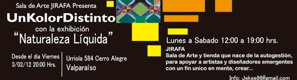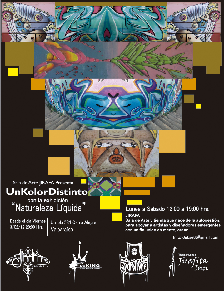 UnKolorDistinto is having an exhibition “Naturaleza Liquida” in JIRAFA, a gallery and a shop, situated in Urrìola 584, Cerro Alegre, Valparaiso. The exhibition opening will be held on 3rd of February at 8 pm.