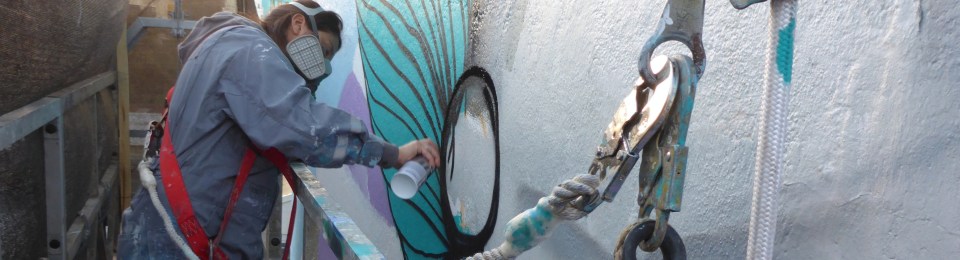 In due time Pablo’s video will appear on Youtube, and who knows, I might appear for one tenth of a second in the corner of one of his frames, capturing my own little videos and photos of Cines and Jekse working. Although I had to leave Valparaiso without seeing my friends finish the project, I did see how they enjoyed opening and arranging the huge buckets of foundation colors and how they lost count of time and spent whole days rolling those cool latex tones into the shapes they had outlined on the wall. I even had a chance to spend some hours high up in the hanging cradle next to Cines, observing one of her first stints of spray painting while rocking in the wind between the earth and the sky of Valparaiso.