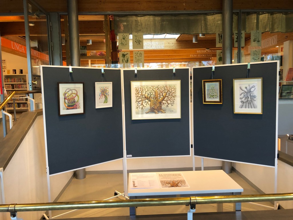 On 3.5.2025 I got up early and went to hang a few of my works in Tammisaari library’s tiny “staircase gallery”. There my mini exhibition Ex herbarium imaginarium (imaginary herbarium) is now in all its glory, and will remain there until May 30th. The five works present imaginary, plant-like creatures that I have made with watercolors, watercolor pencils and charcoal pencils.