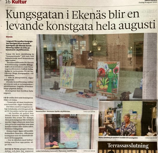 The second, still ongoing group exhibition I am partaking, is Tammisaari Art Association’s Art Street (Konstgatan, Taidekatu) organised between 2nd and 8th of August on Kungsgatan (King’s Street, Kuninkaankatu), a popular shopping street in Tammisaari. I was allowed to enter only one work – Aestas visum somnium – but luckily got to place it in the spacious window of M. Broman, an optician shop, where it has attracted a good amount of positive feedback and even a buyer. Västra Nyland paper also published a story about the Art Street exhibition with photos of some of the works, including mine, but unfortunately forgot to name the artists except one.