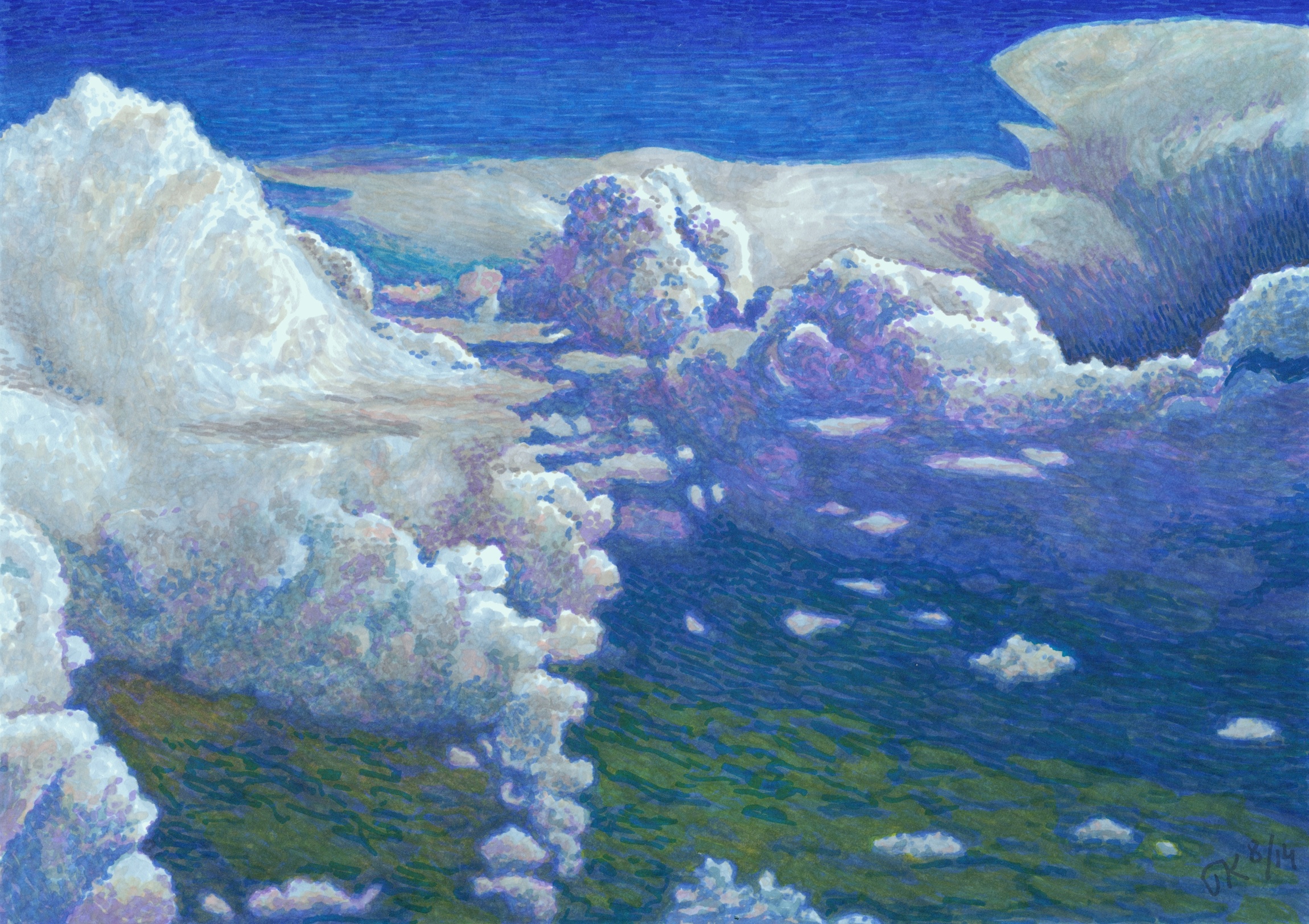 pastels, drawings and other works 06 Wednesday Aug 2014 Original size at 2300 × 1624 ≈ Leave a comment Clouds from the airplane, 6.8.2014. Felt tip markers, 21cm x 29,5cm. Share this: Click to print (Opens in new window) Print Click to email a link to a friend (Opens in new window) Email TweetMore Click to share on Reddit (Opens in new window) Reddit Like Loading...