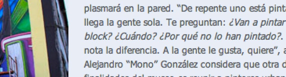 Claudia Pino: El arte callejero se hace museo. Kilometrozero 5/2011; http://www.kilometrocero.cl/2011/05/museo-a-cielo-abierto-de-san-miguel/ (270112)