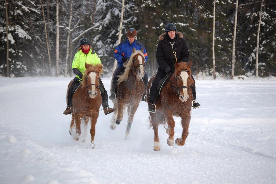 On our first long day trek we covered 37,6 km in 5,20 hours, galloped and trotted a lot, took the horses to a lake to cool down their hoofs, had a picnic by the fire, and then, when the night was already falling, peacefully wandered towards home through the dark, silent forest where only the horses could see the path properly. Since then our treks in Prerya have exceeded the regular two hours several times, and we have had many chances to test and witness the good nature and versatility of the great Finnish breed when riding in rain and storm, stopping for a cup of coffee at the local kiosk, jumping over fallen tree trunks, and racing around a snowy track on a field galloping as fast as we can!