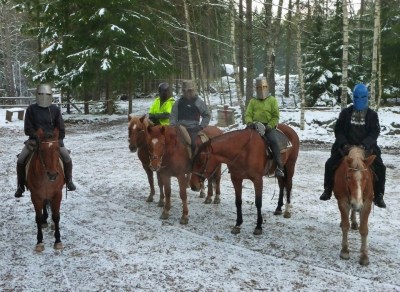 Another riding dream came true in October 2012, when we drove 140 km’s to Rohan Tallit (see also facebook), a stable specialized in medieval riding and shows, situated in Västanfjärd, Kemiö Island on the South-Western coast of Finland. The owners of the stable, Jaakko and Anu Nuotio, besides touring around Northern Europe all summer with their medieval horse show (which they apparently consider holiday!) organize various courses and events on their farm outside the tournament season. Among them are two-day ‘clinics’ on medieval riding and skills at arms, organized on request for small groups of experienced riders.