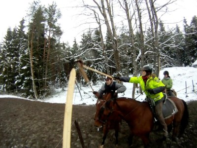 I had Leevi only for a short while before joining with big, handsome Fere, a very sensitive but also a bit temperamental Tori gelding. At one point he got spooked all of a sudden and bucked me off the saddle into the soggy ground. Left side covered in muck but unharmed I climbed back in the saddle, and by the time we started the medieval horse game called ‘mêleé’ later in the afternoon we had already become an excellent team with Fere. In the game one rider carried a rag at the tip of his/her raised (wooden) sword and the others, holding their swords up all the time, are supposed to steal it from there. What is ingenious about the game is that, focusing on the game and completely forgetting to think about the riding, it seems that you and your horse become one mind.